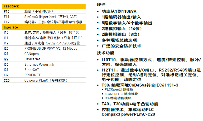 Compax3驅動器為智能伺服驅動器,適用于伺服電機,異步電動機,直驅電機,特點包括:絕對反饋,110/230 VAC,400/460 VAC,單軸技術,多軸技術,現場總線連接,Ethernet通訊,標準安全防護(STO),高級安全防護,IEC 61131-3編程,應用宏。
