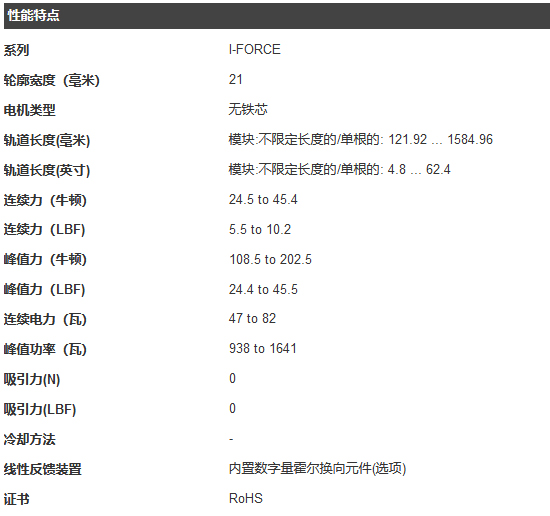 I-Force 110 無鐵芯直線電機峰值推力可達 200N, 卓越的加速度和緊湊的體積. 21mm 寬的無鐵芯設計具有零齒槽效應力,同時工字型骨架繞組提供很高的推力/體積密度比和優越的散熱效果